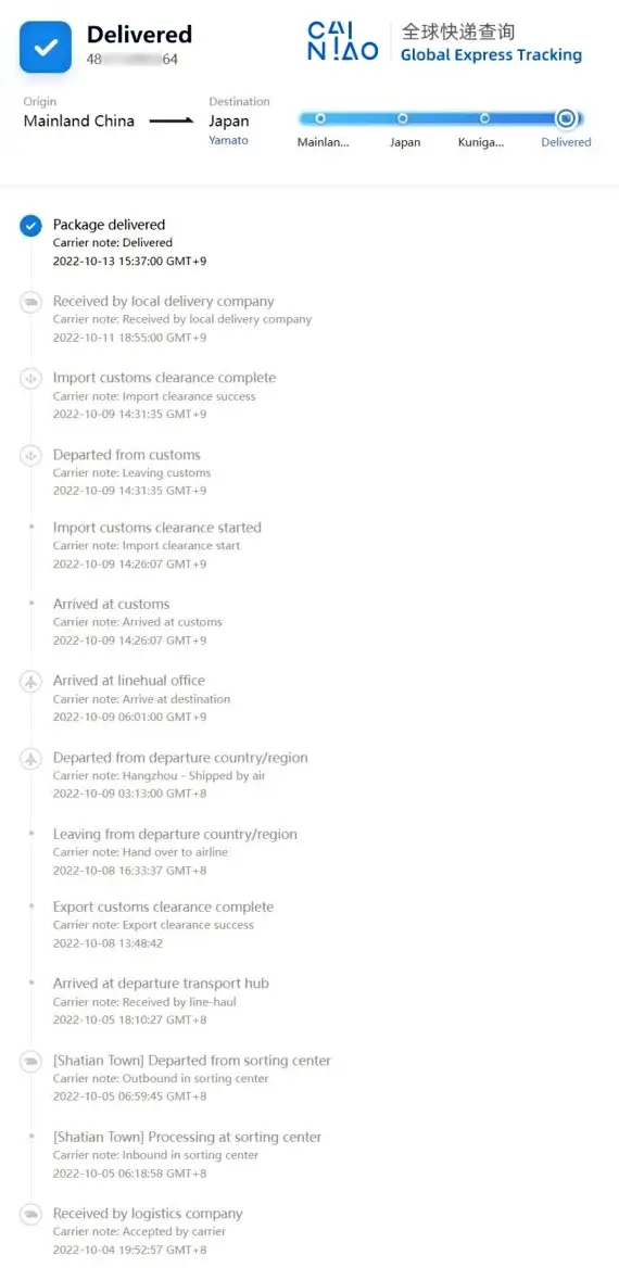 配達状況詳細(CAINIAO Global Express Tracking)