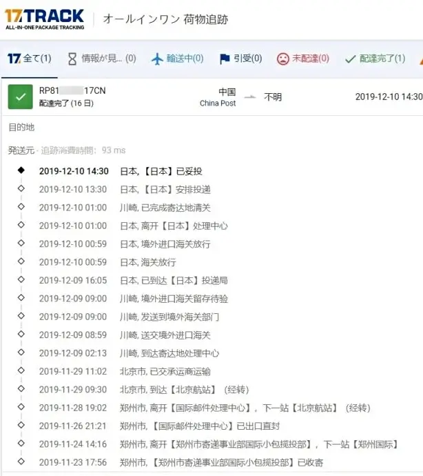 2019-12-09 16:05 日本, 已到达 投递局