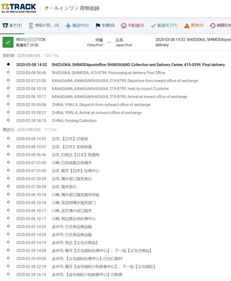 2020-03-08 06:46 日本, 已到达投递局