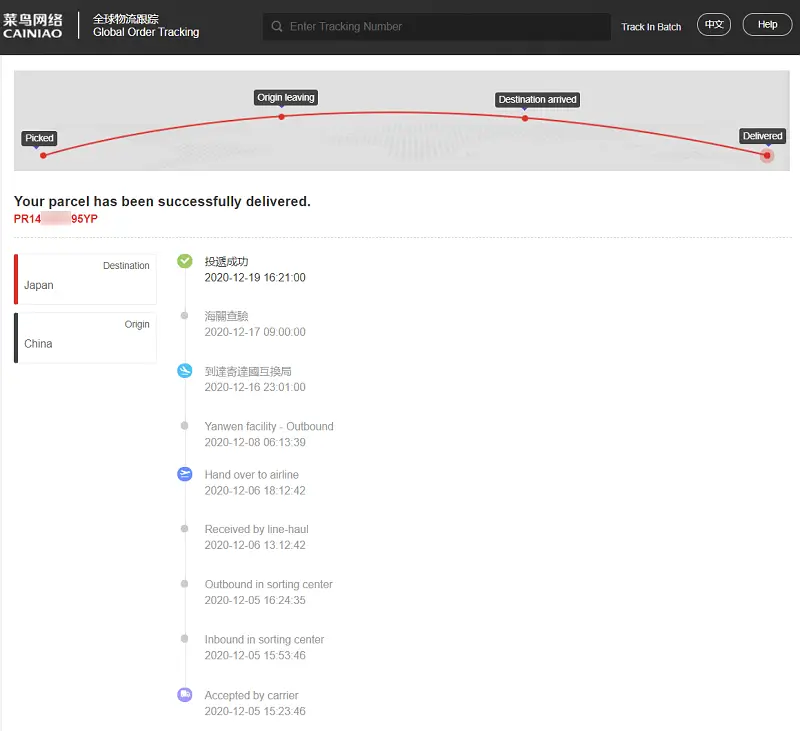 (※2)Yanwen Air Registered Small Package(燕文航空挂号小包)【ヤンウェン航空登録パケット】やAliExpress Standard Shipping(无忧物流-优先)の追跡については、経由地点で「RP---------CN」「LZ---------CN」などに変換される場合があり、その場合は変換後の追跡番号にて追跡は可能になります。