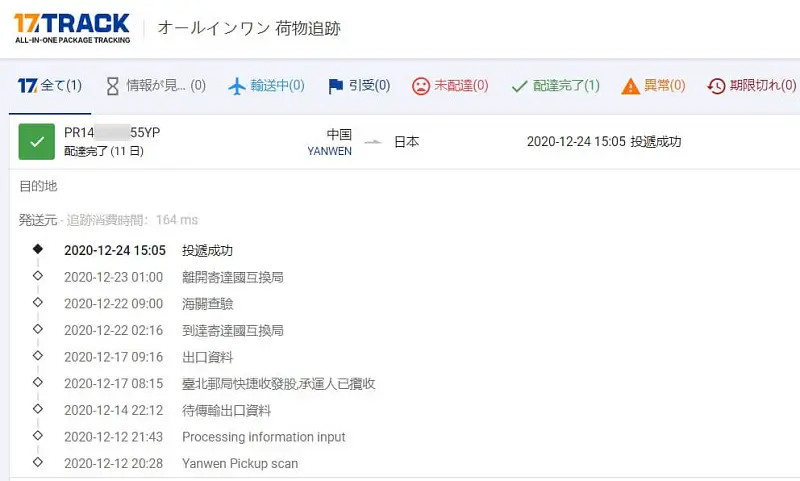 トラッキング情報を見ると配達完了となっていますが、YANWENで発行されたトラッキングナンバーでは追跡できませんでした。配達業者も日本郵便なのか佐川急便なのかも定かではありません。