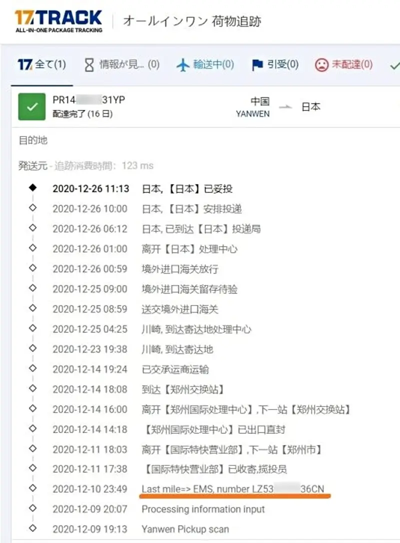 はい。追跡出来ました。YANWENのトラッキングナンバーPR(9桁数字)YPでは日本国内での追跡は出来ません。国際特定記録での取り扱いの場合、LZ(9桁数字)CNに変換されるのでこれにより追跡出来ました。