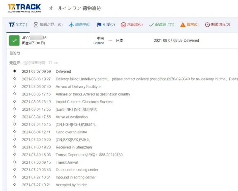 Aliexpressで発行されたトラッキングナンバー【JP00——–76】の輸送業者はCAINIAOで日本国内では追跡出来ず、17track.netで表示される12ケタ【36——–91】がメインのトラッキングナンバーとなります。