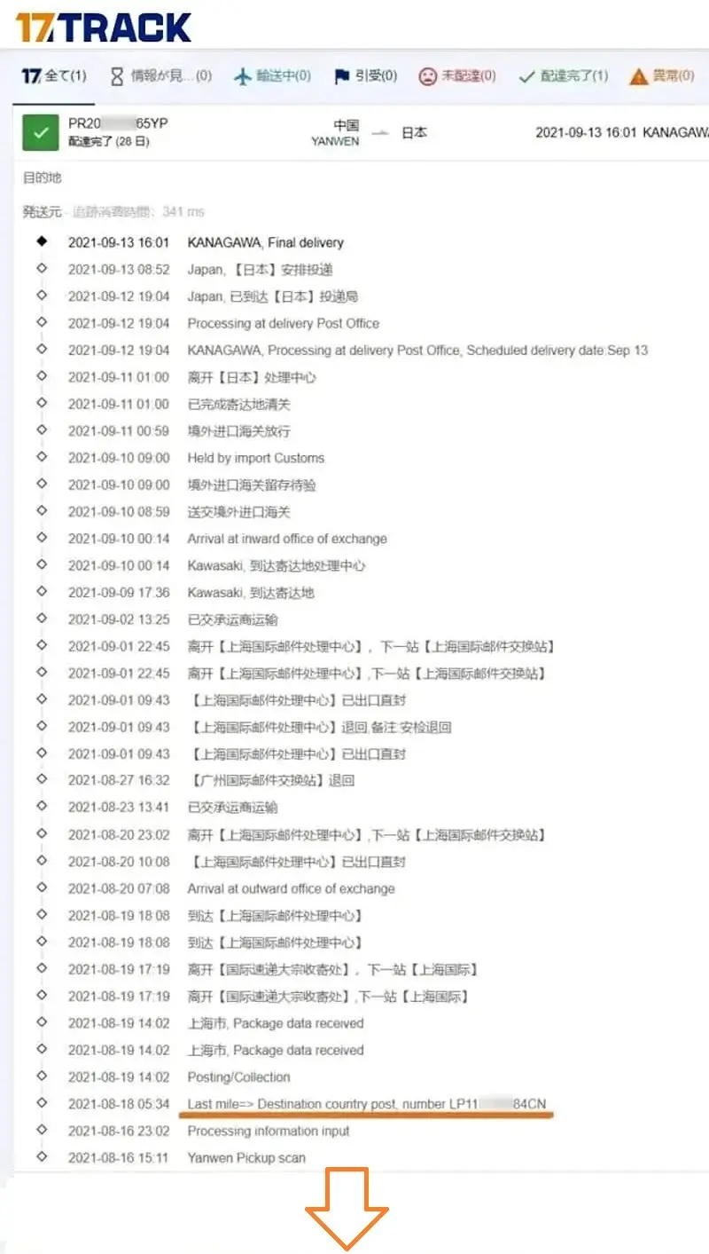 (※2)Yanwen Air Registered Small Package(燕文航空挂号小包)【ヤンウェン航空登録パケット】やAliExpress Standard Shipping(无忧物流-优先)の追跡については、経由地点で「RP---------CN」「LZ---------CN」などに変換される場合があり、その場合は変換後の追跡番号にて追跡は可能になります。
