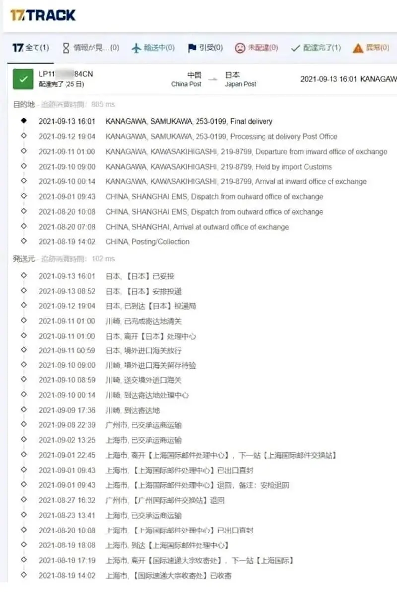 2021-09-11 01:00 川崎, 已完成寄达地清关