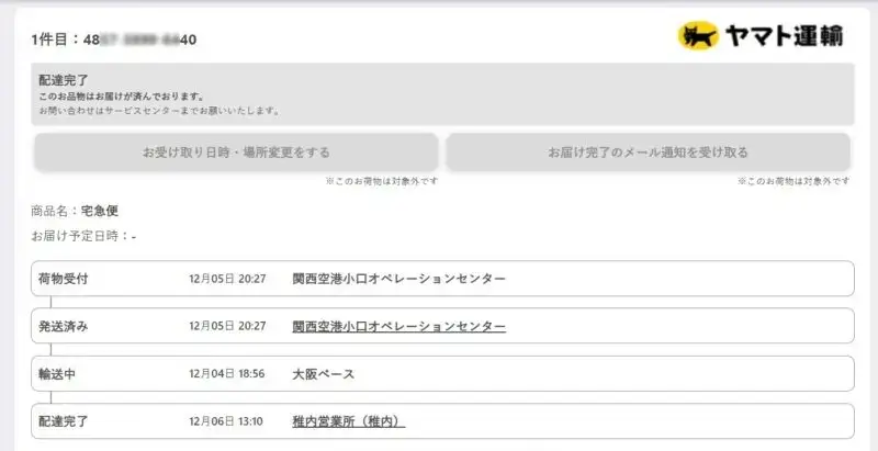 発送済み 12月05日 20:27 関西空港小口オペレーションセンター