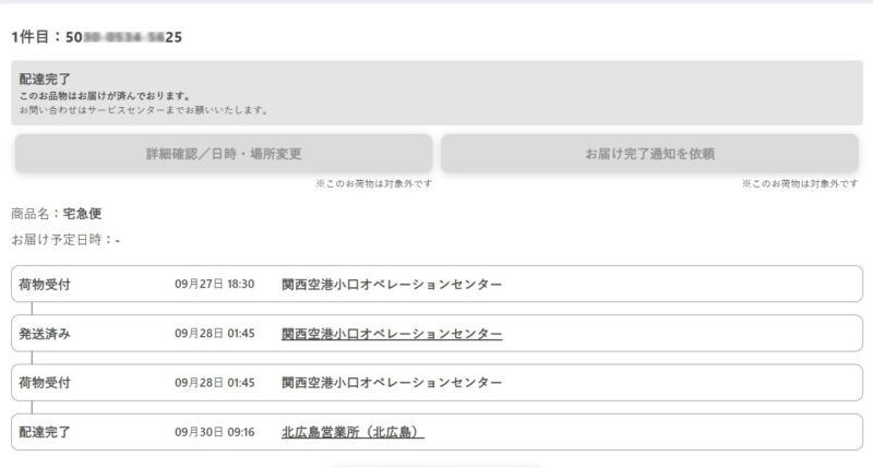 2. 発送済み 09月28日 01:45 関西空港小口オペレーションセンター