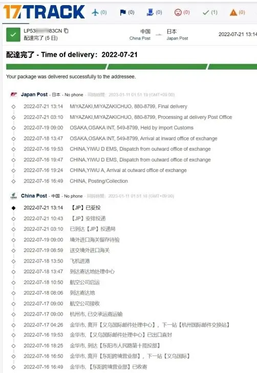 はい、LPで始まりCNで終わる12桁のトラッキングナンバーは日本郵便の郵政追跡サービスで追跡が可能です。
