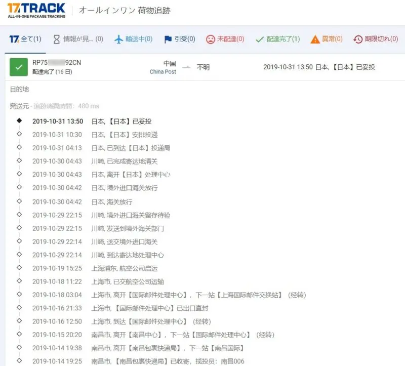 2019-10-16 12:50 上海市、国際郵便処理センター(経由)に到着